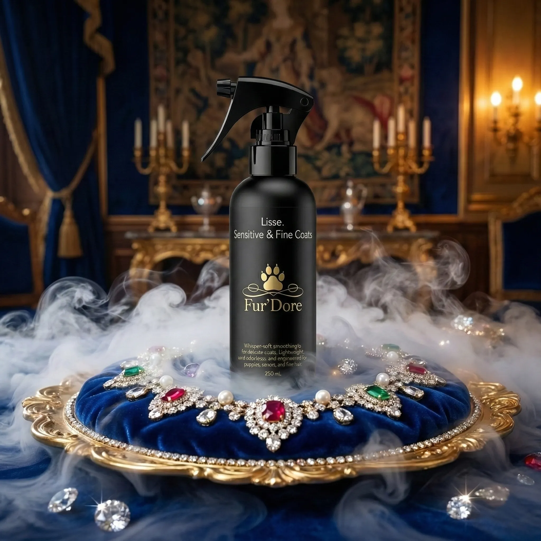 Lisse delivers a soft, weightless finish that calms flyaways, smooths the coat, and leaves fur touchably silky — all without adding scent. Perfect for sensitive pets, puppies, seniors, and fine coats that need a lighter royal touch.